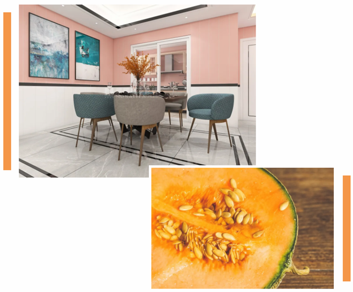 将蜜瓜橙装饰在家中的墙面上,不管是大面积的使用,还是作为配色,都能让bifa必发感受到甜蜜与温馨。与灰色系仿石瓷砖的结合,形成冷暖色的对比,让空间充满活力而不张扬。